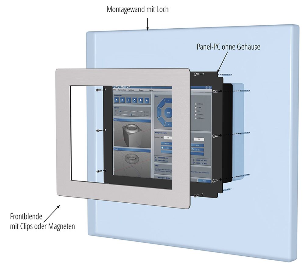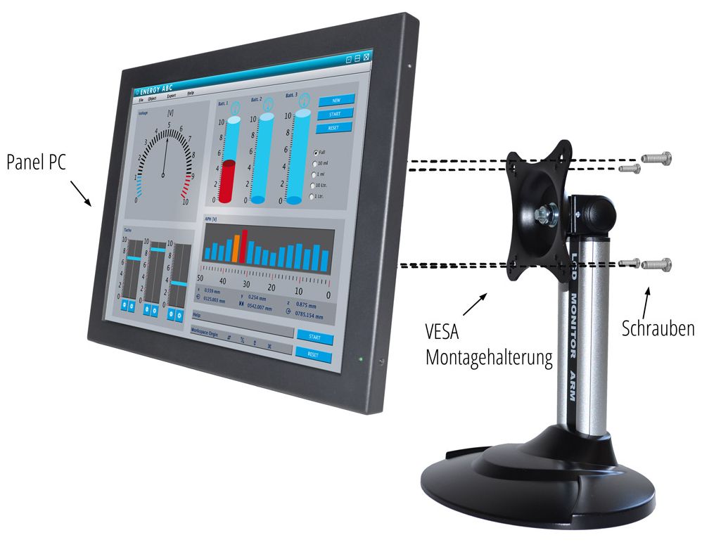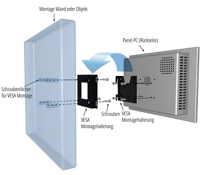 Hochwertige Panel PCs bedürfen einer ebenso hochwertigen Befestigung. Deshalb haben wir für jedes Einsatzgebiet die passende Befestigungsart parat - ob eine fixe Montage an der Wand, verschiedenste VESA-Halterungen mit und ohne Gelenk, oder eine individuell angefertigte Befestigung. Ein Beispiel: Für den Einsatz in der Gebäudeautomation eignet sich besonders die Wall-Mount-Montage. Hierbei wird das System ohne Gehäuse in ein passendes Loch an einer beliebigen Stelle wie beispielsweise einer Wand gesetzt und von vorne verschraubt. Danach wird ebenfalls von vorne eine aufsetzbare Frontblende, z.B. mit Clips oder Magneten, befestigt. Das verhindert einerseits unschöne Schraubenköpfe, hat andererseits aber den praktischen Nutzen, das der Panel-PC bei Wartungsarbeiten sofort erreichbar ist. Egal ob Sie sich für eine der normierten VESA-Befestigungen entscheiden oder eine individuelle Halterungs-Lösung suchen. Dank unserer jahrzehntelangen Erfahrung sind wir der ideale Partner, wenn es um die richtige Befestigung Ihres Panel-PCs geht. Sollte die gewünschte Halterung dabei nicht in unserem Angebot enthalten sein, helfen wir Ihnen mit unserer reichen Erfahrung aus zahlreichen, erfolgreich umgesetzten Projekten gerne weiter. Unser Beraterteam steht Ihnen jederzeit für eine Anfrage zur Verfügung. Für einen ersten Überblick finden Sie nachstehend eine kurze Erläuterung der gängigsten Befestigungs-Methoden.